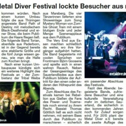 Fazit des Abends: begeisterte Bands, zufriedene Besucher und eine kulturelle Veranstaltung mehr im östlichen Sauerland, die sicherlich in den kommenden Jahren noch für Zulauf sorgen wird. Für 2015 plant der Metal Diver e.V. bereits die zweite Auflage des Festivals und freut sich auch über die weitere Unterstützung des Vereins durch Interessierte. Besonderer Dank gilt den Sponsoren, Bands und der gesamten Festivalcrew an diesem Abend. Informationen, Bilder und auch Videos gibt es in den nächsten Tagen unter www.metaldiver.de und unter www.facebook.com/metaldiverfestival